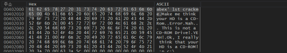 이어서 “Error Nah”, “This is not a CD-ROM Drive!”, “YEAH!”, “ok, I really think that your HD is a CD-ROM!” 문자열이 있다.
