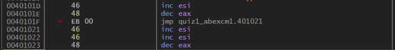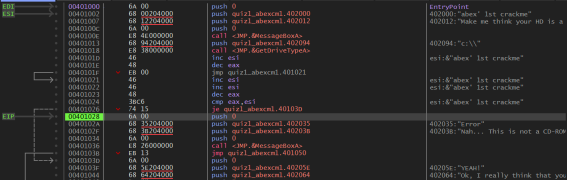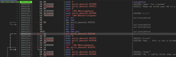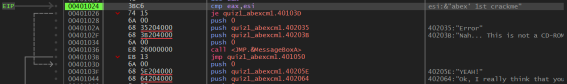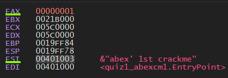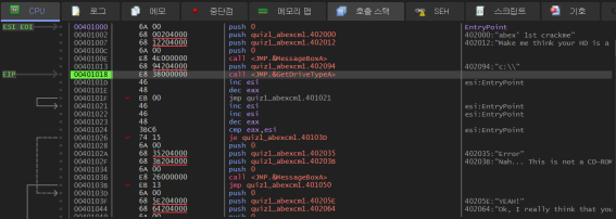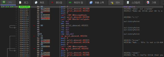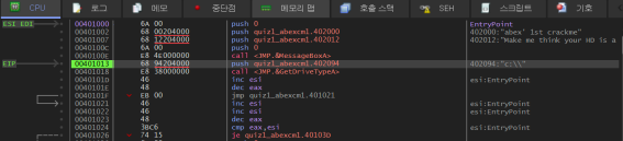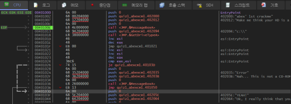 x32dbg를 사용해 quizq_abexcm1.exe 파일을 열고 EP로 이동하면 위의 사진과 같이 나온다.