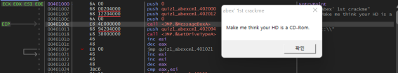 40100E 주소의 call 명령을 실행하면 messagebox가 뜨고, 확인을 누르면 401013 라인으로 EIP가 이동한다.