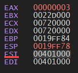 이후 위의 명령을 통해 eax의 값은 1이 되고, esi의 값은 401003되며