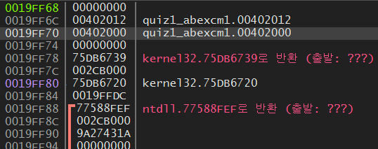 EIP를 40100E까지 위치시키면 스택에는 위의 보이는 것과 같이 402000주소와 402012 주소가 쌓인다.