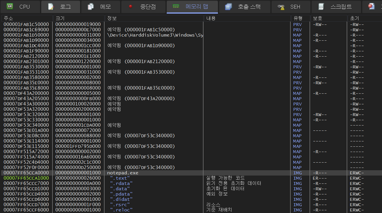 notepad.exe의 ImageBase 값은 7FF65CCA0000이다.