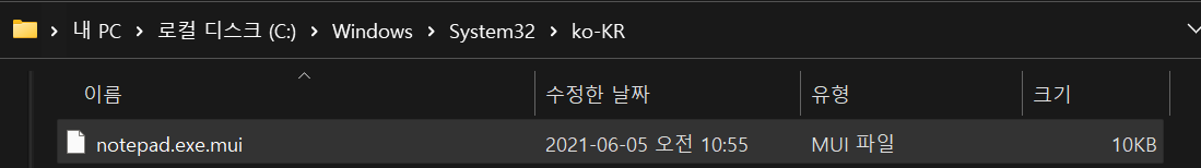 (ko-KR 폴더는 notepad.exe 파일과 동일한 경로 안에 존재하면 되고, ko-KR 폴더 안에는 notepad.exe와 동일한 이름을 가진 .mui 파일이 있어야 한다.)
