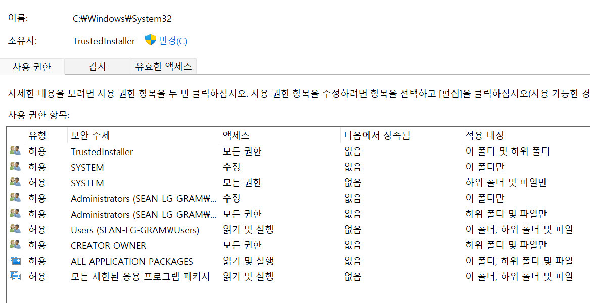 C:\Windows\System32 폴더는 읽기 전용으로 권한이 설정되어 있고, 보안 정책 역시 TrustedInstaller를 제외한 일반 사용자 및 관리자 계정은 쓰기 권한이 없게 설정되어 있어서 C:\Windows\System32 내에 존재하는 파일들을 수정하고 싶을 때는 해당 폴더의 권한을 수정해야 한다.
