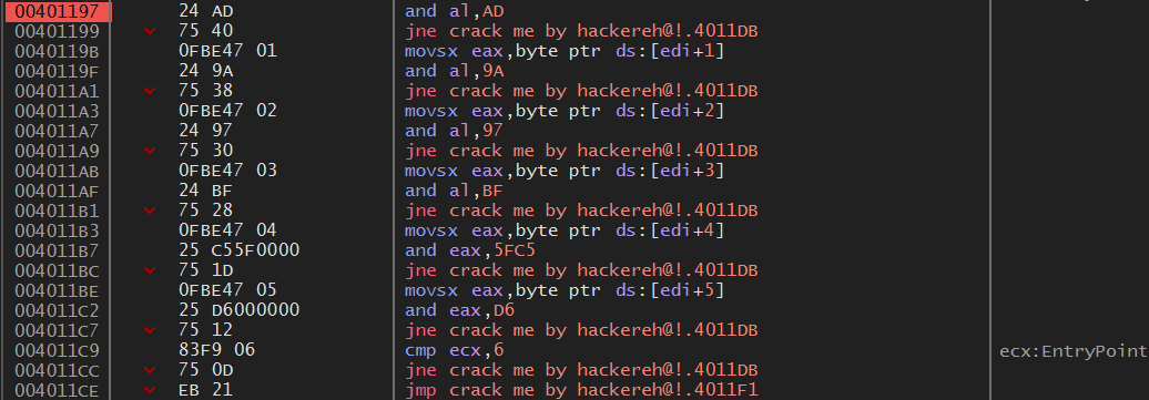 1 ~ 6번 모두 and 연산 후 jne 명령으로 4011DB 주소로 jmp 한다.