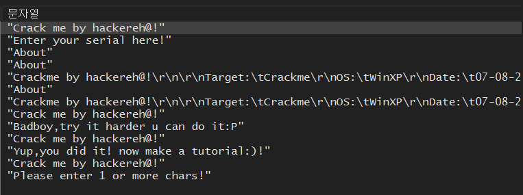 4011F8 주소에 “Yup, You did it! now make a tutorial:)!”가 보이고 그 밑에는 401207 주소에 “Please enter 1 or more chars!” 라는 문자열이 있다.
