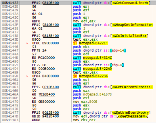 x32dbg에서 notepad.exe를 재실행할 때마다 위에서 봤던 주소 값들은 로딩 주소에 맞게 매번 변경된다.