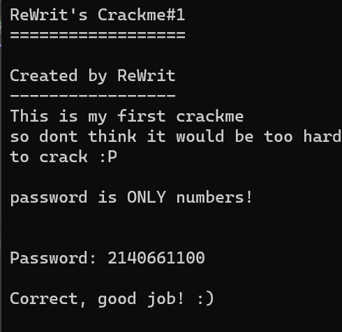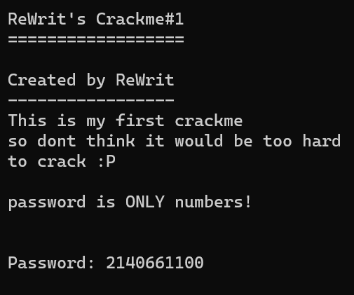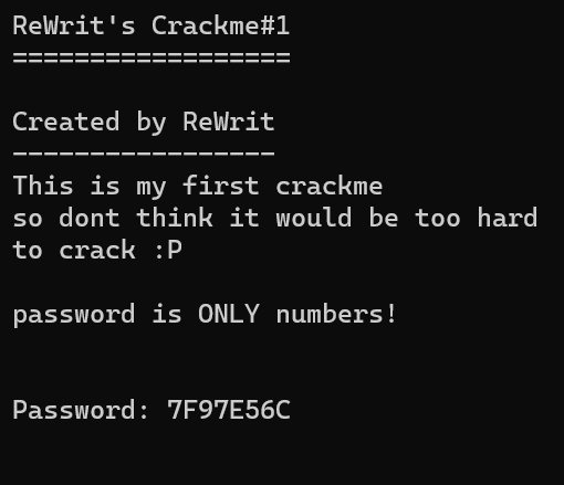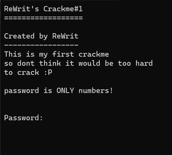 Crackme 6번을 실행하면 위의 사진과 같이 ReWrit의 Crackme#1번 문제라는 것과 어렵게 생각하지 말라는 것과 패스워드는 오직 숫자로만 되어있다는 것을 문구로 띄워주고 Password 입력을 기다리고 있다.