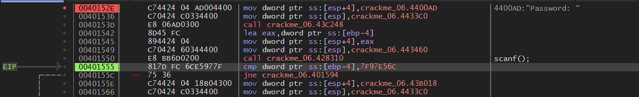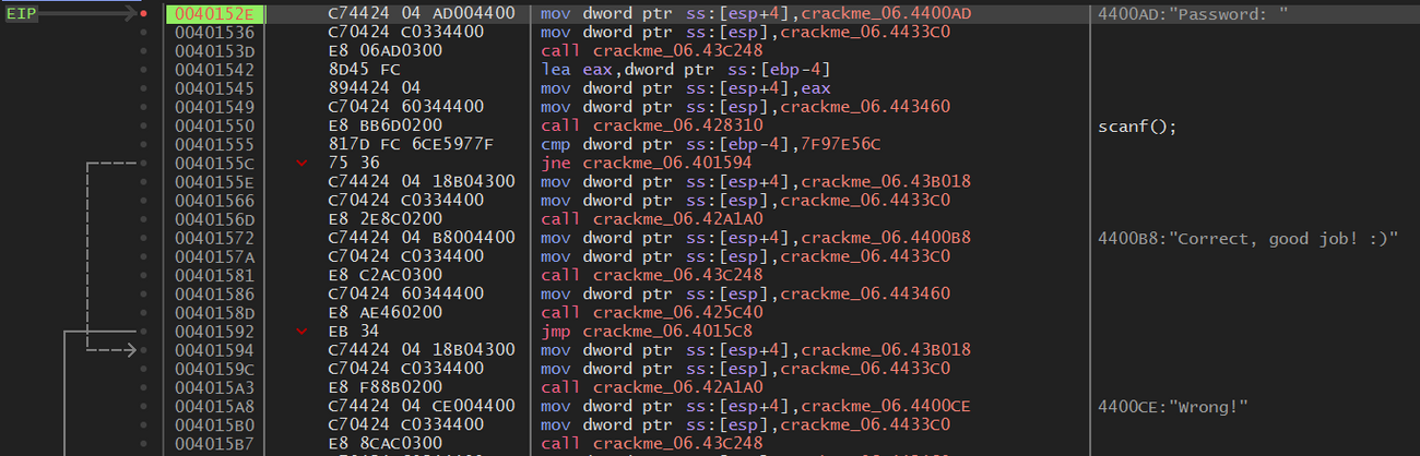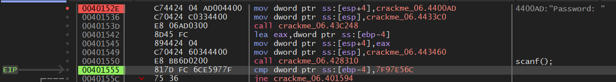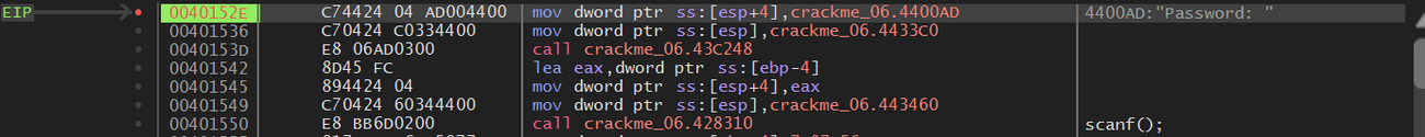 즉, ebp-4 주소에 있는 값을 esp+4 주소에 담고, 443460 주소에 있는 값을 esp로 담은 뒤 호출하는데 이 부분은 “Password:” 문자열을 띄우고 Password를 입력받는 부분이므로 scanf() 같은 함수이다.