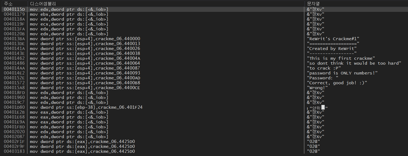 문자열 찾기 기능을 이용하면 위의 사진과 같이 프로그램 실행 시 봤던 문구들이 적혀있다.