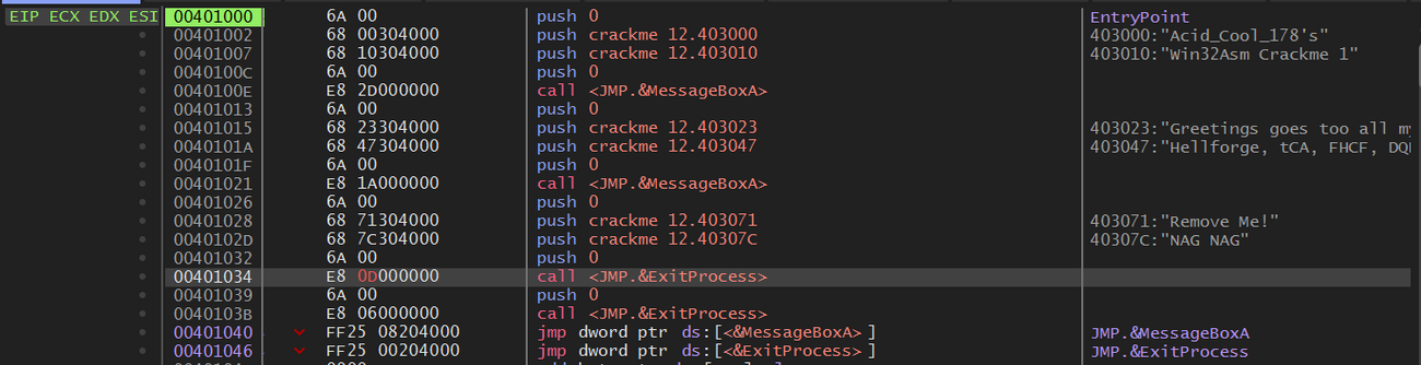 401034 주소의 명령을 보면 MessageBoxA 함수를 호출하는 401040 주소를가 써져있다.