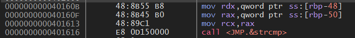 40160B 주소의 루틴을 보면, 사용자가 입력한 문자를 rax 레지스터에 저장하고, 비교할 문자를 rdx 레지스터에 저장한 후 strcmp 함수를 호출한다.
