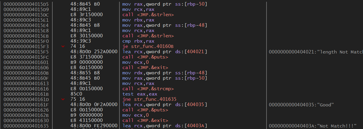 4015F3 주소에서 입력된 패스워드 문자열의 길이와 비교할 문자의 길이를 비교해서 같을 경우 40160B로 점프하여 입력한 문자와 비교할 문자가 같은지 비교하고, 같지 않을 경우 4015F5 주소로 가서 length Not Match!!! 메시지를 출력한다.