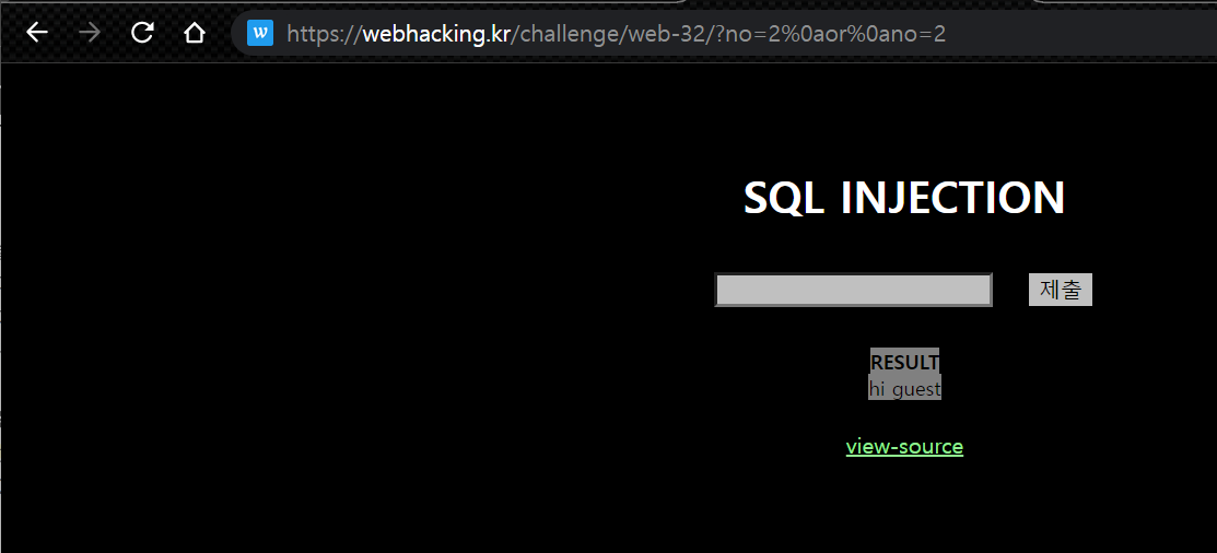 https://webhacking.kr/challenge/web-32/?no=2%0aor%0ano=2