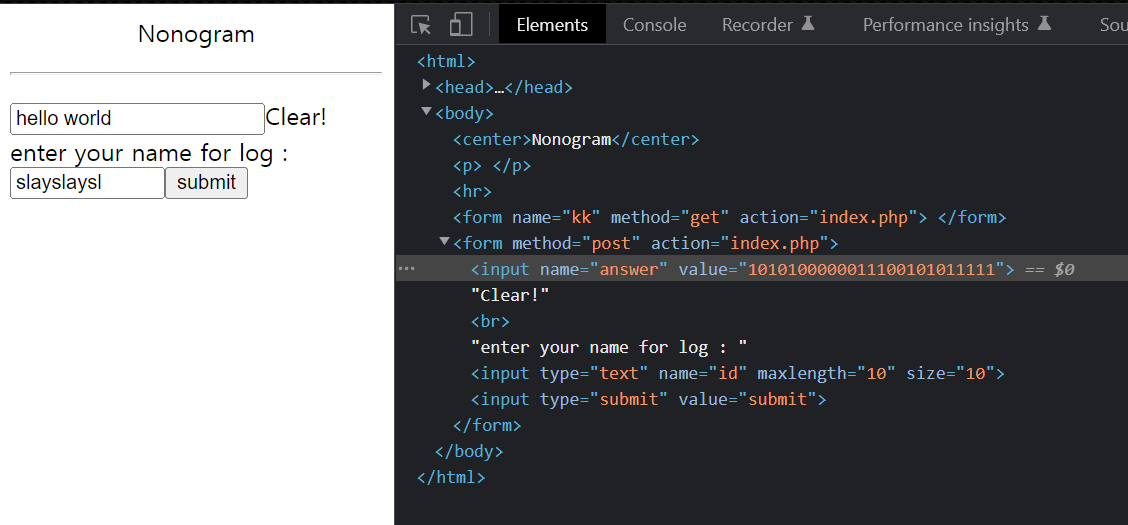 그리고 value로 이전에 보았던 이진수가 적혀져 있는데, 이 element의 name이 answer인 것으로 보아 이 element를 이용해 답을 찾는 것 같다.