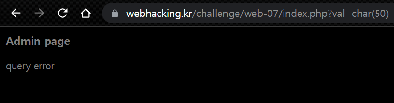 하지만 char(50)으로 val의 값을 2로 만들어주면 query error가 뜬다.