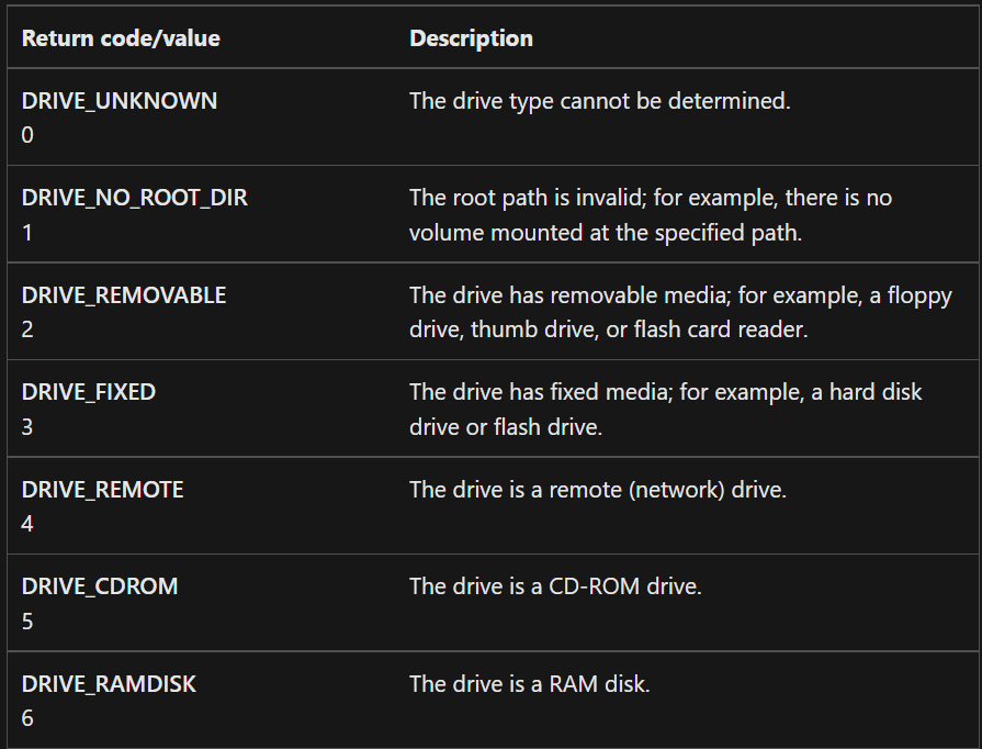 https://docs.microsoft.com/en-us/windows/win32/api/fileapi/nf-fileapi-getdrivetypea
