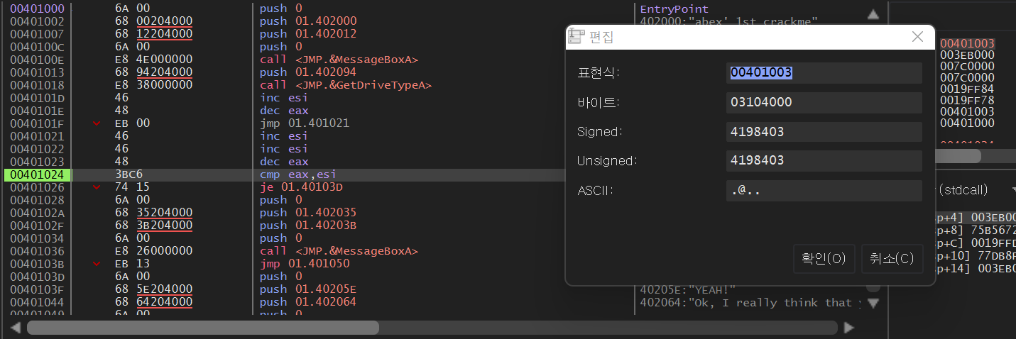 위의 사진과 같이 EIP를 401024 주소에 위치시켜 CMP 명령이 실행되기 바로 직전 상황에서 레지스터의 값 부분을 더블 클릭해 401003으로 수정한 뒤 F8키로 실행하면 아래와 같이 성공 메세지 박스가 뜬다.