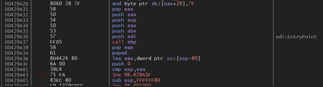 디버거로 열어 EP 코드를 확인하면 위와 같이 해제된 원래의 EP 코드가 나온다.