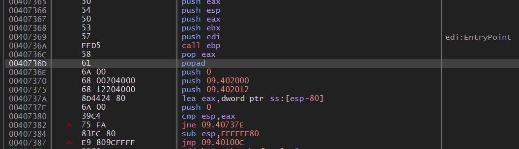 원래 UPX 패킹의 특성은 EP 코드가 PUSHAD와 POPAD로 둘러싸여 있고, POPAD 다음에 바로 OEP로 가는 jmp 문이 있는데 위의 사진은 StolenByte로 인해 popad와 jmp 사이에 PUSH 명령어를 통해 후에 OEP로 이동 후 호출할 함수에서 사용될 인자들을 스택에 넣는다.