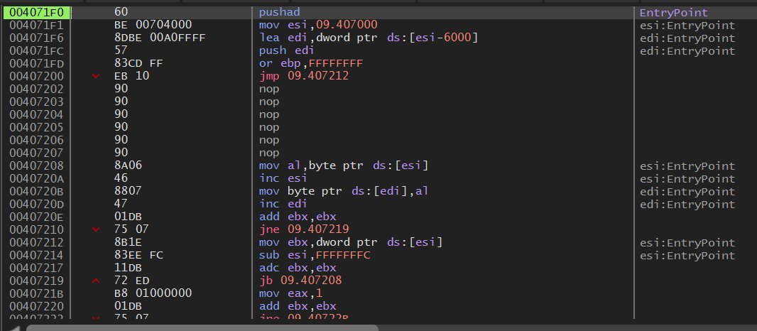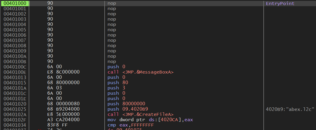 하나 특이한 점은 40100C 주소 위의 주소들의 명령들이 전부 nop이라는 것이다.