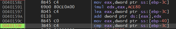 ebp-3C 주소에는 D8017이라는 값이 들어있는데, 이 값을 eax에 저장하고 D8017과 ACE80을 곱한 값인 E4B88D80를 edx에 저장한다.