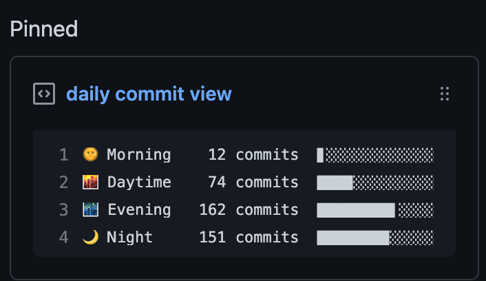 이 통계는 아침, 점심, 저녁, 새벽 중에 커밋을 가장 많이 하는지를 보여주는 통계이다.