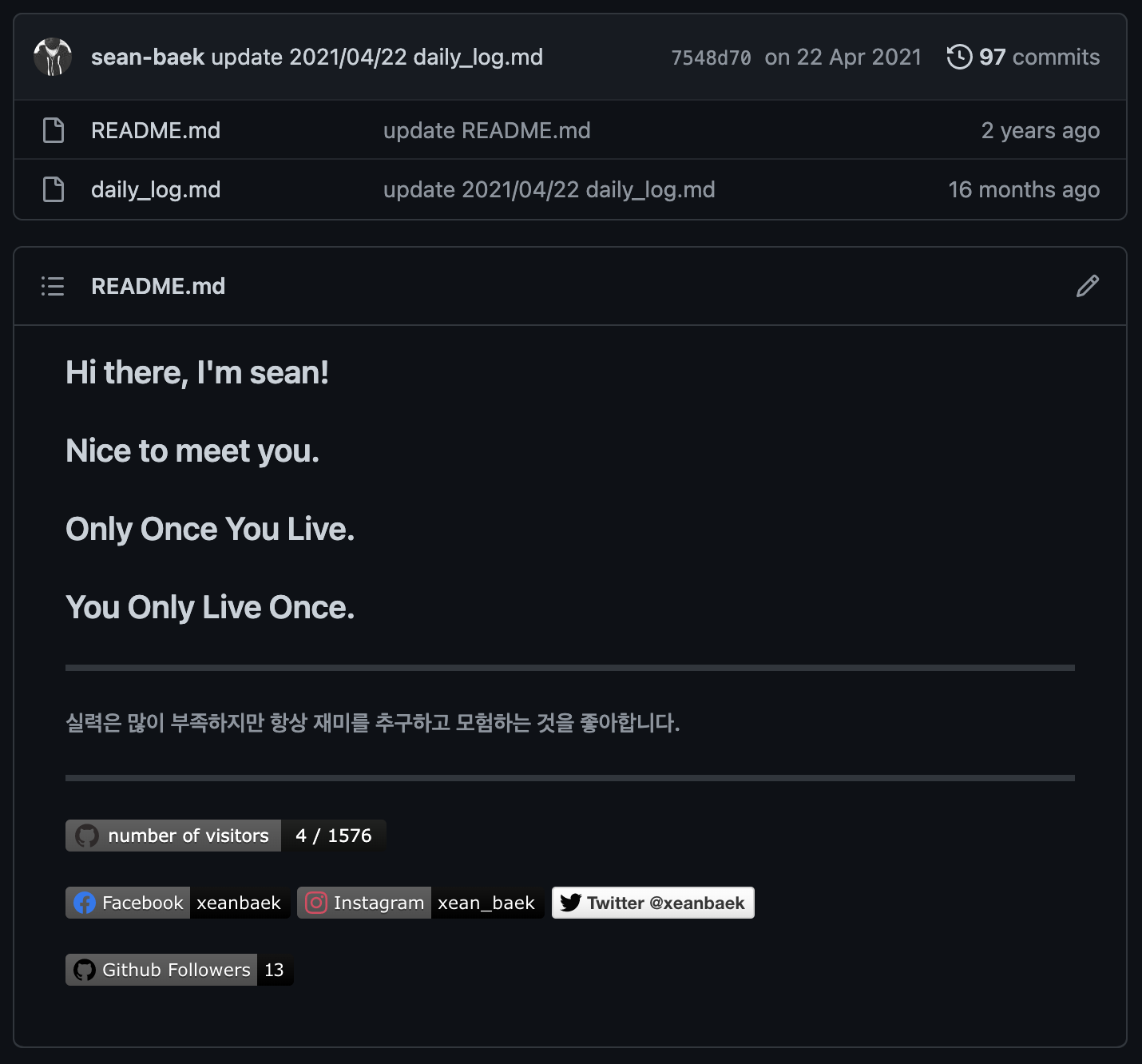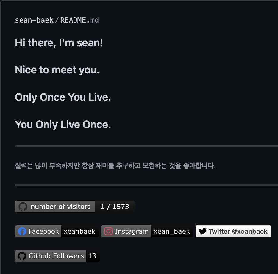 README.md 파일에는 기본적으로 짧은 인사말이나 소개글, 기술 스택, 연락처 등을 적는 것을 추천한다.