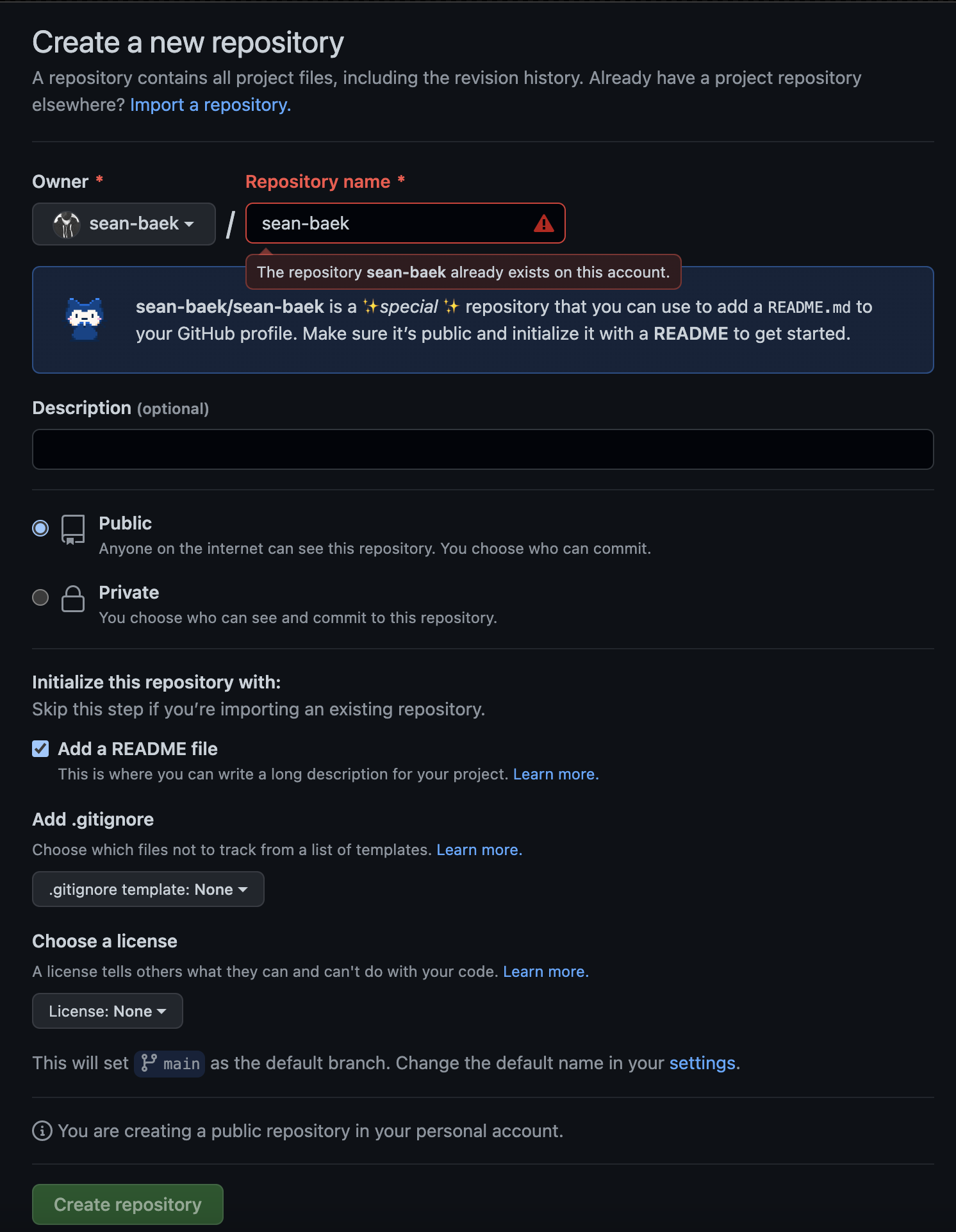 (현재 필자는 이미 계정 이름과 동일한 이름의 Repository가 만들어져 있으므로 위의 사진에서 빨간색이 뜨는 것이다.)
