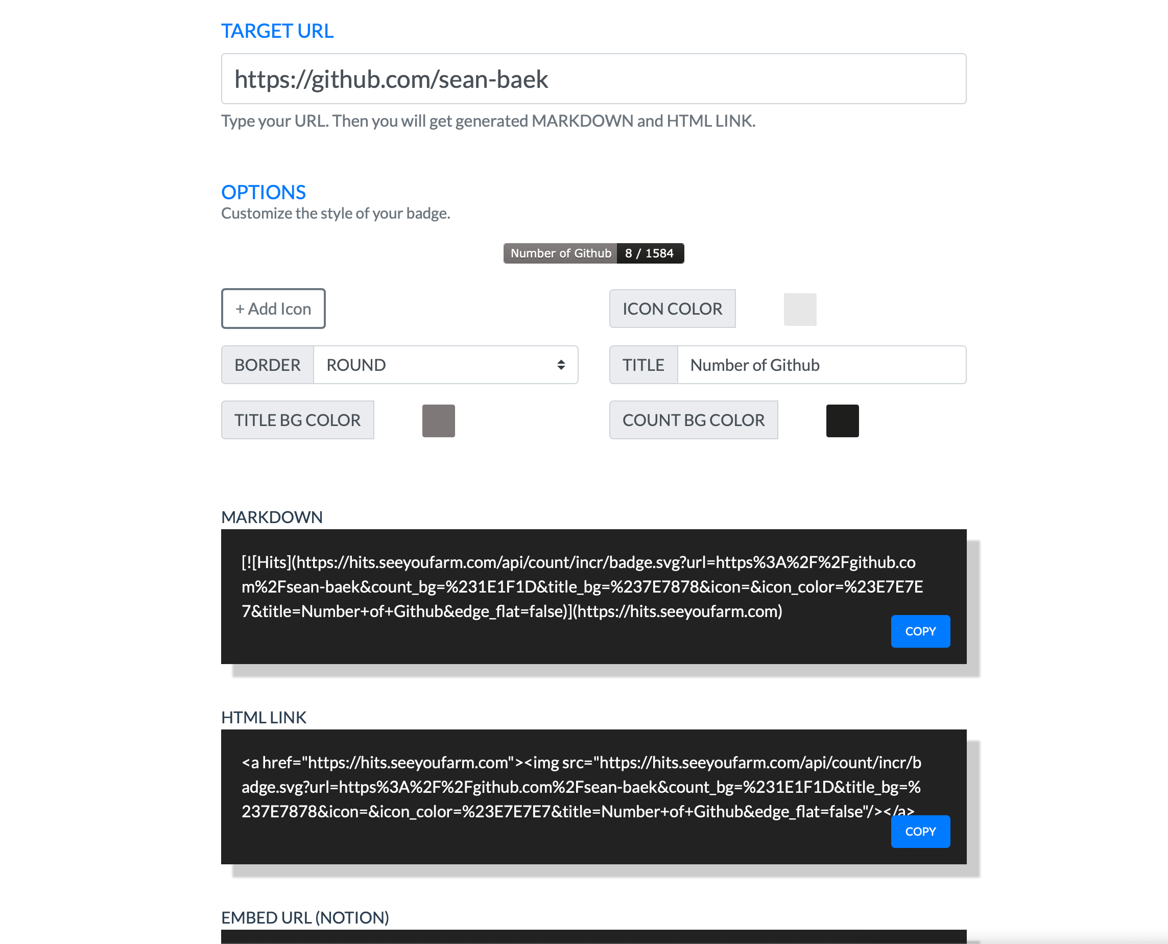 방문자 수를 표시할 "Github 계정 주소"나 "레포지토리 주소"를 입력하고, "ICON COLOR", "TITLE", "TITLE BG COLOR", "COUNT BG COLOR" 항목을 설정하면 아래에 MARKDOWN, HTML LINK, EMBED URL(NOTION) 형태로 변환해준다.