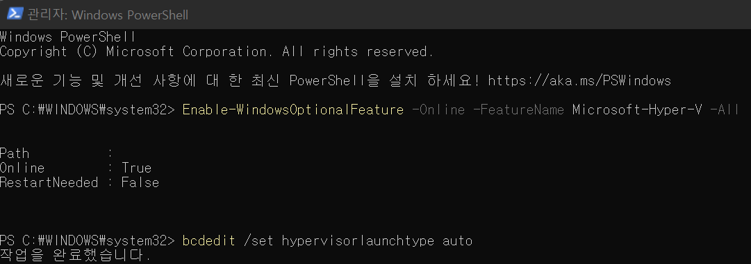 그리고 두 번째 명령어는 부트로더에서 Hyper-V 기능을 활성화하도록 하는 명령어이다.