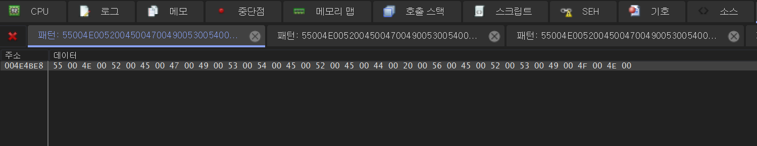 먼저 메모리 맵 탭에서 Ctrl + B를 누른 후 UNICODE에 UNREGISTERED VERSION 이라고 입력하고 확인을 누른다.