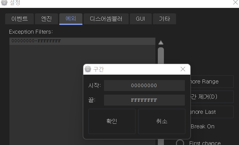 Ctrl + F2를 눌러 재실행 한 후 설정 -> 예외 -> Ignore Rnage -> 시작 : 00000000, 끝 : FFFFFFFF -> 확인 -> 엔터 -> F9
