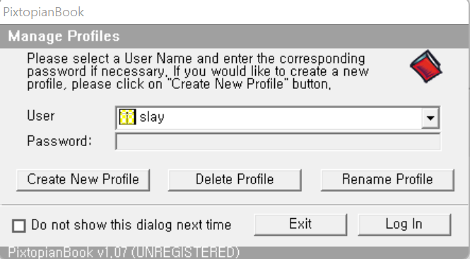 이전에 만든 프로필 slay를 선택하고 Login in 버튼을 누른다.