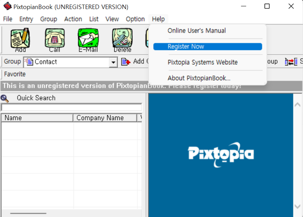하지만 이 프로그램의 타이틀에 적힌 "UNREGISTERED VERSION" 문구도 그렇고 Quick Search 위에 적힌 "This is an unregistered version of PixtopianBook. Please register today!" 문구가 적힌 것을 보니 등록되지 않은 버전이라 등록해야 하는 것 같다.