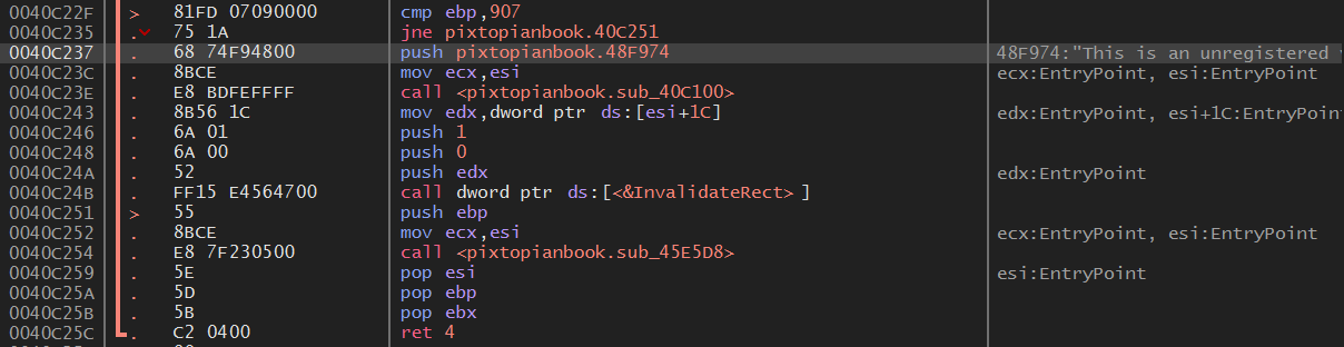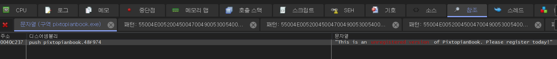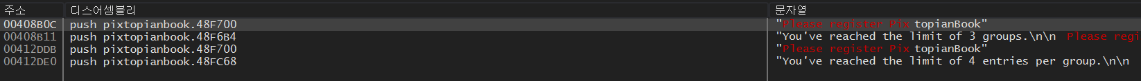 디버거의 참조 탭에서 "Please register PixtopianBook"을 검색해보면 위와 같이 나오는데 하나는 그룹을 3개 이상 생성하려고 할 때의 문자열과 다른 하나는 사람 정보를 4개 이상 생성하려고 할 때의 문자열이다.