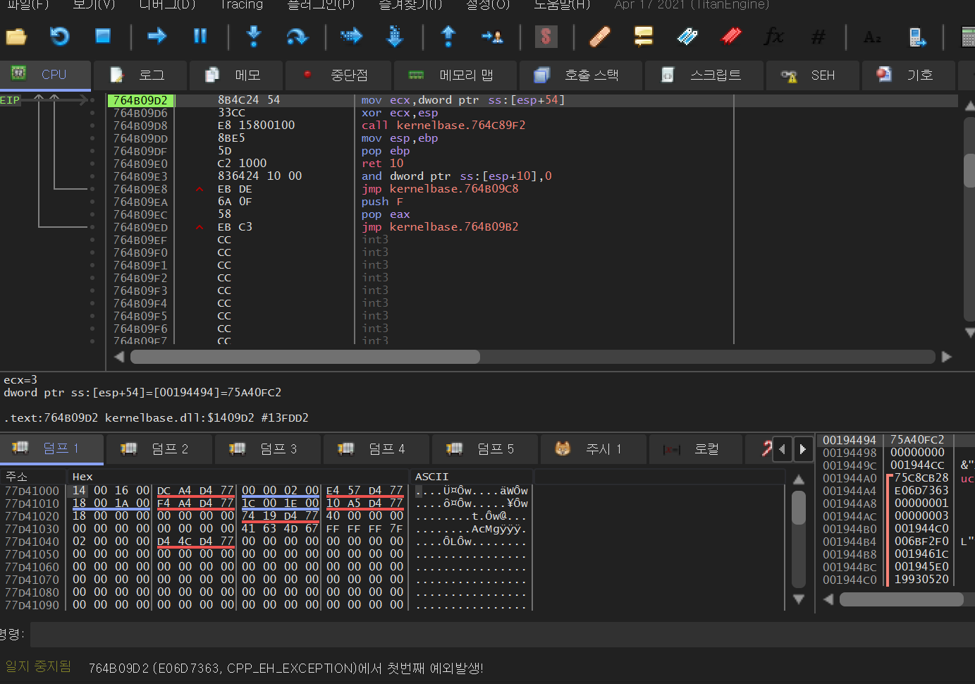EP 코드에서 F9 키를 눌러 실행하면 위와 같이 예외를 만나게 된다.