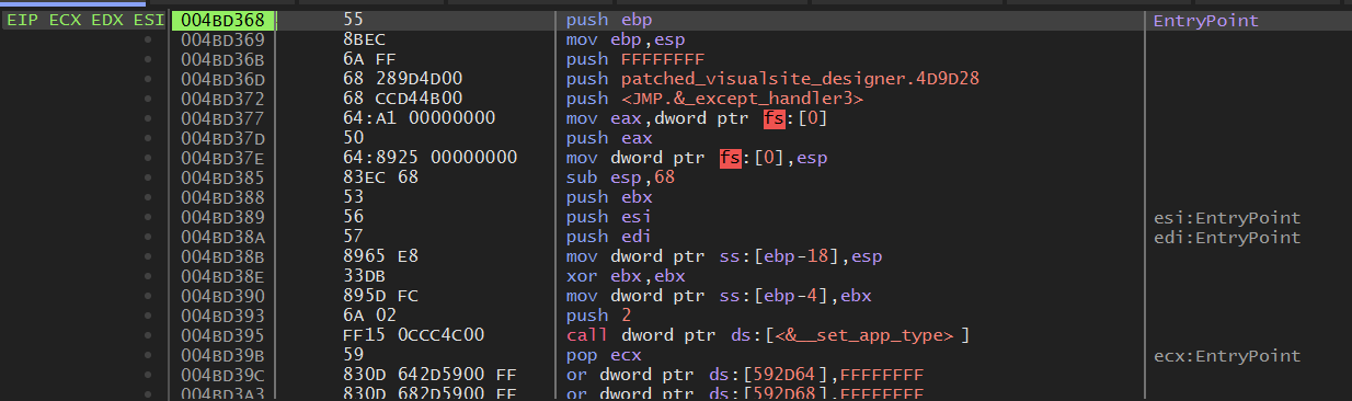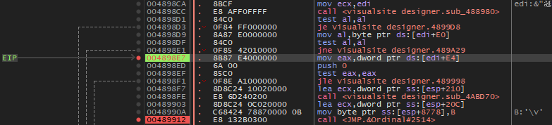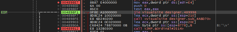 대쉬('-') 키를 눌러서 이전 어셈블리어 코드로 돌아가다 보면 위와 같이 489912 주소가 마지막 Visualsite Designer 영역이다.