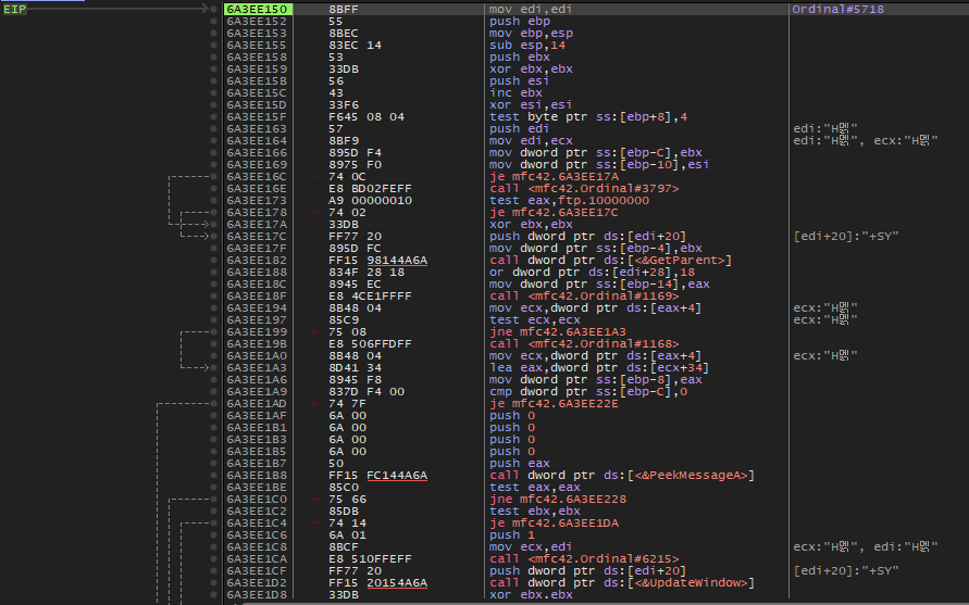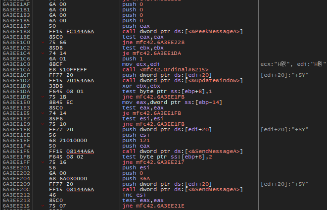 스크롤을 조금 내려보면 PeekMessageA(), UpdateWindow(), SendMessage() 등 WinAPI 함수들이 보이는데