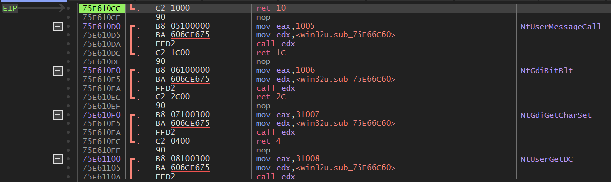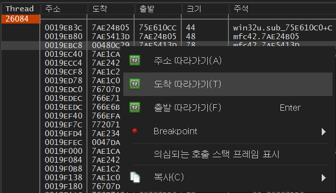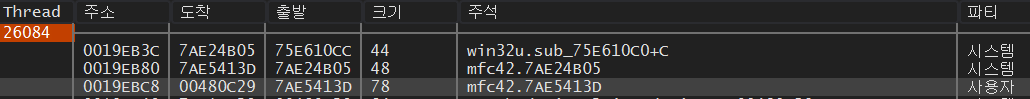 그러면 위와 같이 DLL 파일 영역의 주소 부분 75E610CC에서 멈추게 된다.