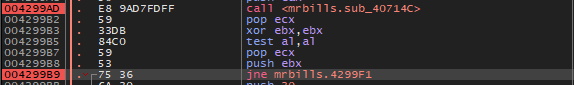 그렇다면 eax 레지스터를 and 연산하는데 이때 eax에 들어있는 값은 4299AD 주소에서 호출하는 함수의 반환값일 것이다.