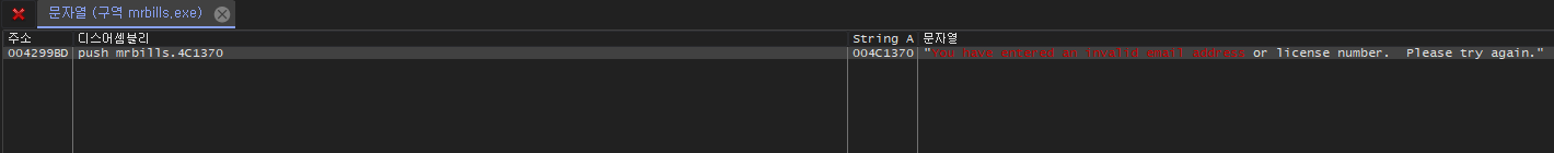 같으면 이전에 봤던 "You have entered an invalid email address or license ~~" 문자열을 띄운다.