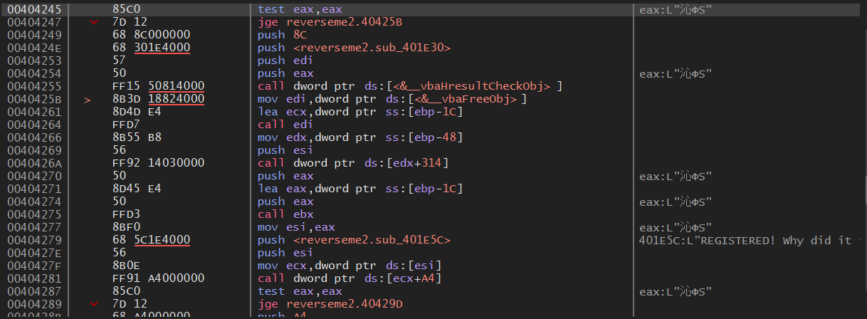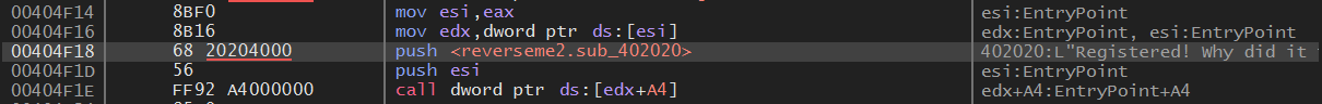 스크롤을 더 올려보면 위와 같이 404F18 주소에서 "Registered! Why did it take so long?" 문자열을 참조한다.