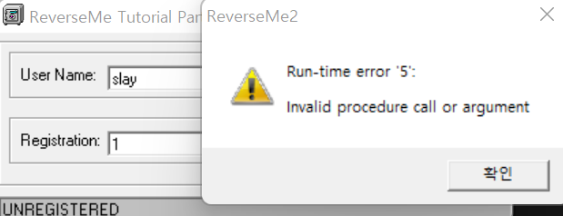 위와 같이 "slay"를 입력하고 Registration에 입력하려고 했더니 run-time error가 떴다.