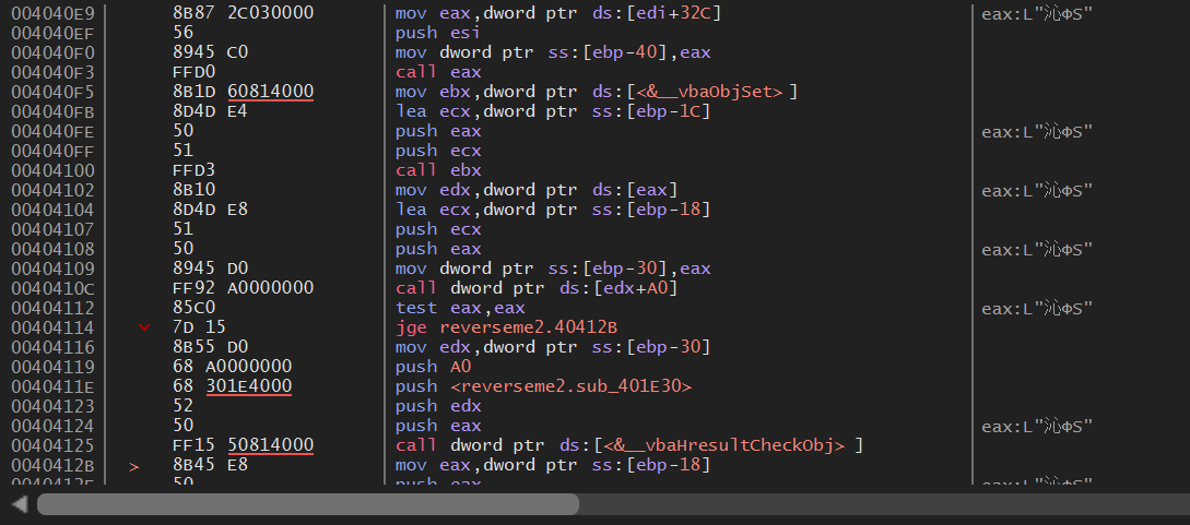 F8 키를 눌러 진행하다보면 4040E3 주소에서 vbaFileOpen 함수를 호출하게 되는데, 이 함수의 인자를 보면 reginfo.key 라는 이름이 있다.