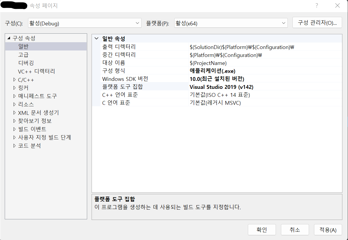 2. 일반 -> 플랫폼 도구 집합 -> 자신의 Visual Studio 버전에 맞는 거 선택 -> 적용 -> 확인