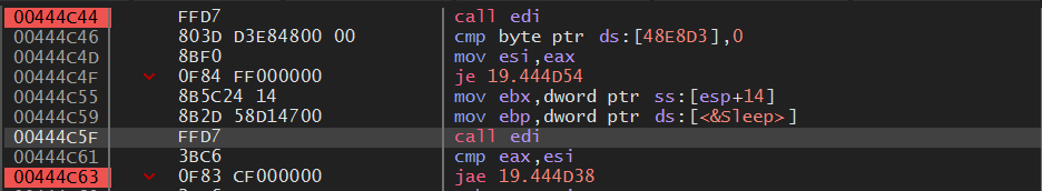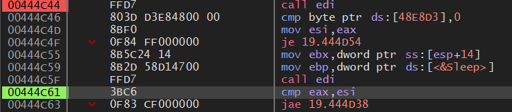eax의 값이 더 작으면 A(10)을 스택에 넣고, ebp에 있는 함수(sleep 함수)를 호출한 뒤 48E8D3 주소의 값과 0을 비교후 0이 아니면 444C5F 주소로 가서 timegettime() 함수를 호출한다.