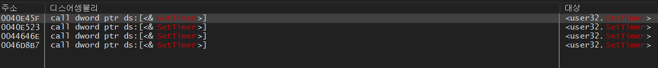 x32에서 SetTimer 함수를 검색해보니 위와 같이 4개가 나왔고