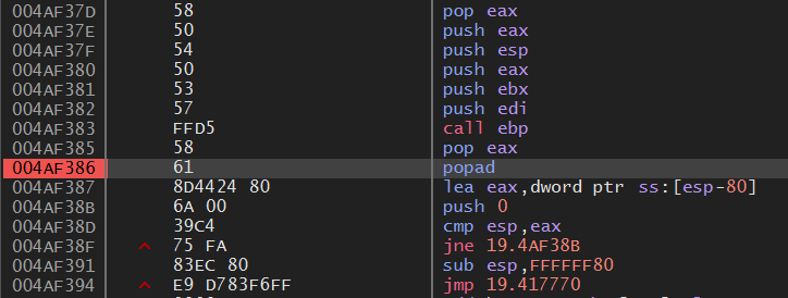 스크롤을 쭉 내리다보면 위와 같이 4AF386 주소에 popad 명령어가 있다.