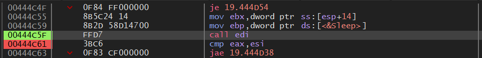 eax의 값은 1A615A6이고, esi의 값은 1A5E6A7이며 EAX가 더 크기 때문에 444C63 주소의 조건 분기는 성립되어 444D38로 점프한다.